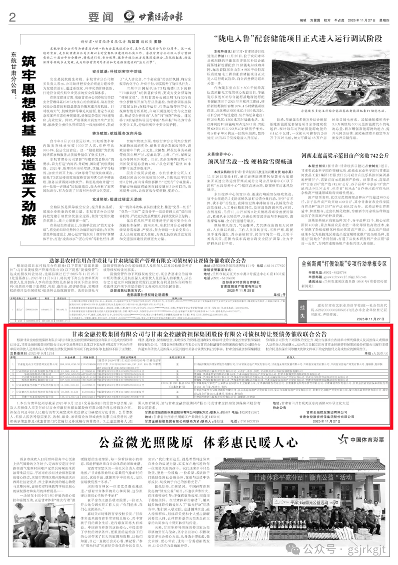 必赢官方(中国)总部与甘肃金控融资担保集团股份有限公司债权转让暨债务催收联合公告