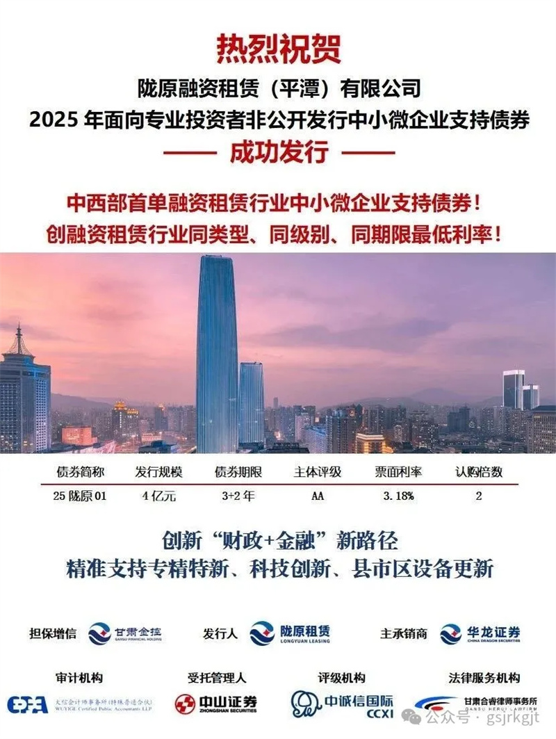 陇原租赁充分依托必赢官方(中国)总部“财政+金融”模式优势,以财政政策引导、金融服务协同、投融资联动等方式,吸引资本市场资金全力支持我省实体经济。7月28日,陇原租赁在上交所成功发行中小微企业支持债券,规模4亿元,期限3+2年,票面利率3.18%,认购倍数2倍,是中西部省份首单融资租赁行业中小微企业支持债券,创融资租赁行业同类型、同级别、同期限历史最低利率。