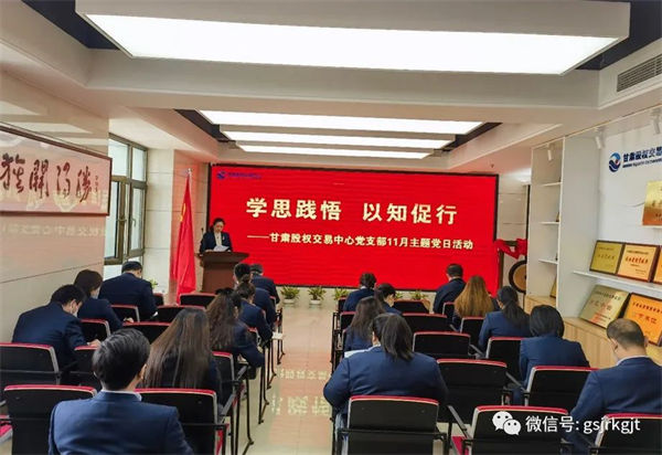 甘肃股权交易中心党支部认真落实集团党委部署,紧密结合工作实际,制订深入学习宣传贯彻党的二十大精神工作举措,组织开展“学思践悟 以知促行”主题党日活动,系统学报告、学党章,专题观影《领航》,参加“金徽杯”党的二十大精神线上知识竞赛,深入开展研讨交流,切实把全体干部员工思想和行动统一的党的二十大精神上来,以昂扬向上的精神状态,务实的工作作风,苦干实干、担当作为,全力推动国企改革三年行动高质量收官,聚焦主责主业,竭力服务“专精特新”等企业发展,奋力书写新时代股交工作新答卷。